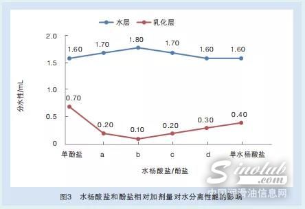 由图 3 可见,当基础油和其他添加剂种类及加剂量相同时,船用发动机油产品 A 水分离性能随烷基水杨酸盐和硫化烷基酚盐相对加剂量的变化而不同,当烷基水杨酸盐和硫化酚盐相对加剂量为 b 时,水分离性能最好。