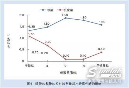 由图 4 可见,当基础油和其他添加剂种类及加剂量相同时,船用发动机油产品 B 水分离性能随磺酸盐和硫化烷基酚盐相对加剂量的变化而不同,当磺酸盐和硫化酚盐相对加剂量为 b 时,水分离性能最好。