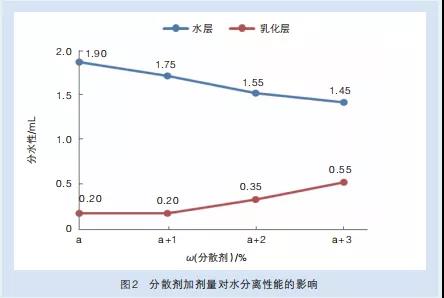 分散剂是一种在分子内同时具有亲油性和亲水性两种相反性质的表面活性剂,极易形成胶团,具有较好的分散作用和增溶作用。船用发动油产品中常用的分散剂以丁二酰亚胺为主,其化学结构由亲油基(烃基)、极性基和连接基团三部分组成。在船用发动机油产品 A 中考察丁二酰亚胺分散剂加剂量对水分离性能的影响,结果见图 2。