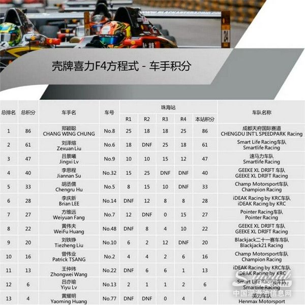 此役过后,郑颖聪以86分领跑车手积分榜,刘泽煊(61分)和吕景曦(47分)暂居二三。郑颖聪的成功也让他所在的成都天府国际赛道车队两获车队冠军并高居车队积分榜头名,Smart Life Racing车队以67分排在第二,GEEKE XL DRIFT车队以61分位居第三。