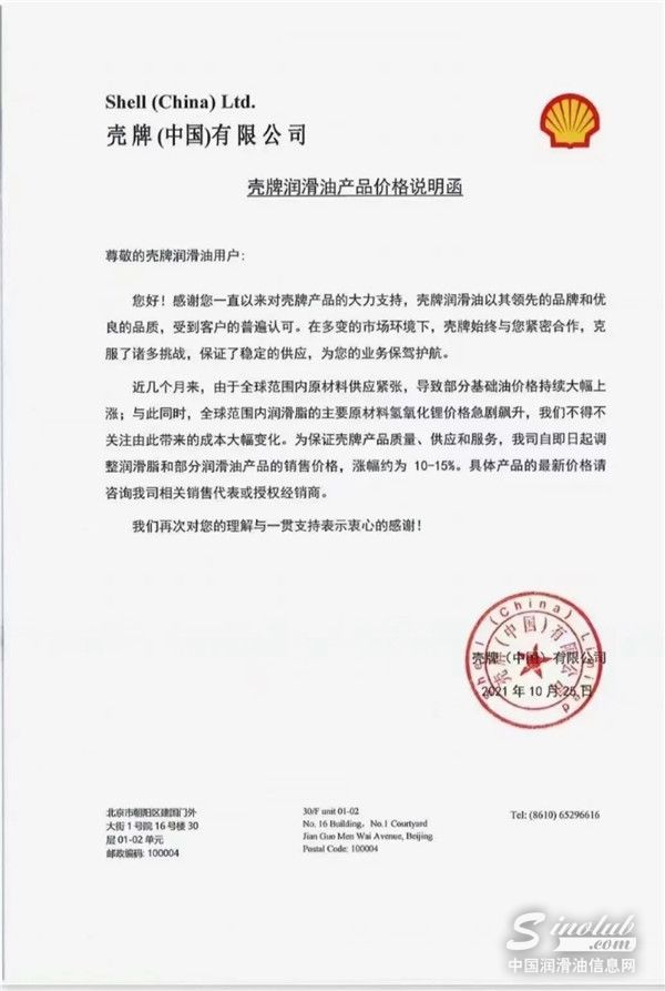 据中国润滑油信息网从市场获悉,壳牌(中国)有限公司10月25日向其用户发出《壳牌润滑油产品价格说明函》,自即日起调整润滑脂和部分润滑油产品的销售价格,涨幅约为10-15%。这为近期持续刷圈的润滑油涨价函,增加了重磅的一页。作为连续多年蝉联全球最大的润滑油生产和供应商,壳牌的动作颇受市场关注。