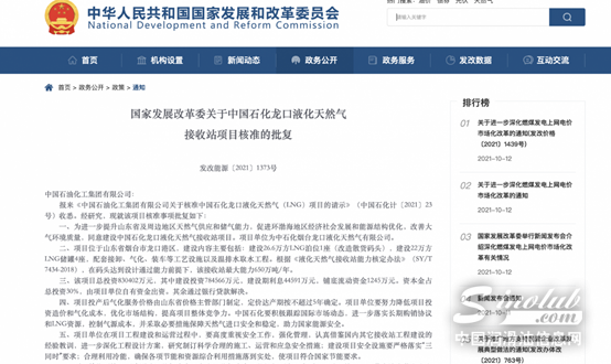 10月13日,国家发展改革委网站发布了《关于中国石化龙口液化天然气接收站项目核准的批复》:为进一步提升山东省及周边地区天然气供应和储气能力,促进环渤海地区经济社会发展和能源结构优化,改善大气环境质量,同意建设中国石化龙口液化天然气接收站项目。项目单位为中石化烟台龙口液化天然气有限公司。