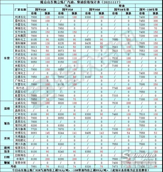 地炼成品油价11月17日,最高涨300元/吨(来源:隆重资讯)