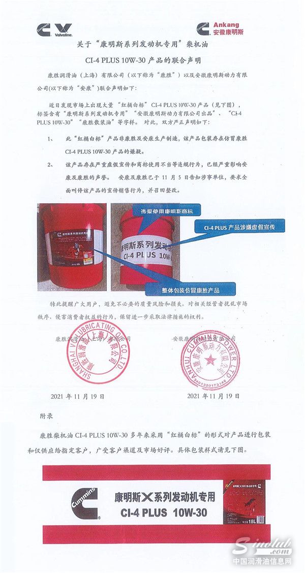关于“康明斯系列发动机专用”柴机油CI-4 PLUS 10W-30产品的联合声明