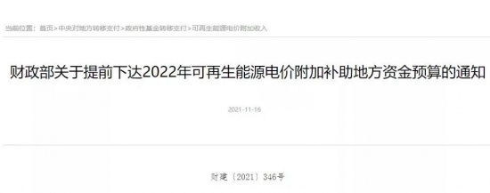 11月16日,中央预算公共平台发布“关于提前下达2022年可再生能源电价附加补助地方资金预算的通知”。根据通知,本次下达总计新能源补贴资金38.7亿元。其中,风电15.5亿元、光伏22.8亿元、生物质3824万元。