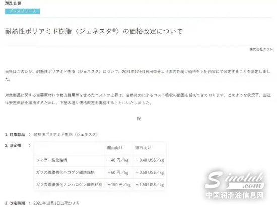 11月18日,日本可乐丽发布涨价通知,称将于2021年12月1日起上调其耐热性聚酰胺树脂 PA9T的售价,涨幅最高达1.5美元/千克(约9566元/吨)。