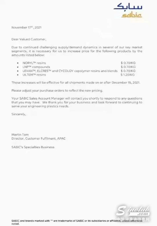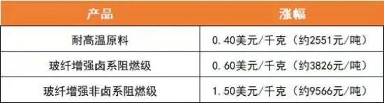 11月17日,SABIC发布涨价通知,通知称将于12月15日起上调包括PC、PA、PPO、PEI等在内的部分工程塑料产品的售价,具体涨幅如下: