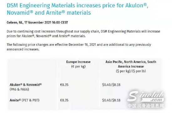 11月17日,帝斯曼称由于整个供应链持续短缺,帝斯曼工程材料将提高Akulon®、Novamid®PA6&PA66和®PET&PBT等工程塑料的价格,涨幅均为0.4美元/千克(2551元/吨)。此次价格调整将于12月16日起生效,是此前所有涨价通知的补充。