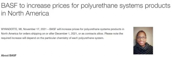 此外,12月1日起,巴斯夫将再度上调北美聚氨酯产品的价格,特定聚氨酯体系涨幅有望更高。