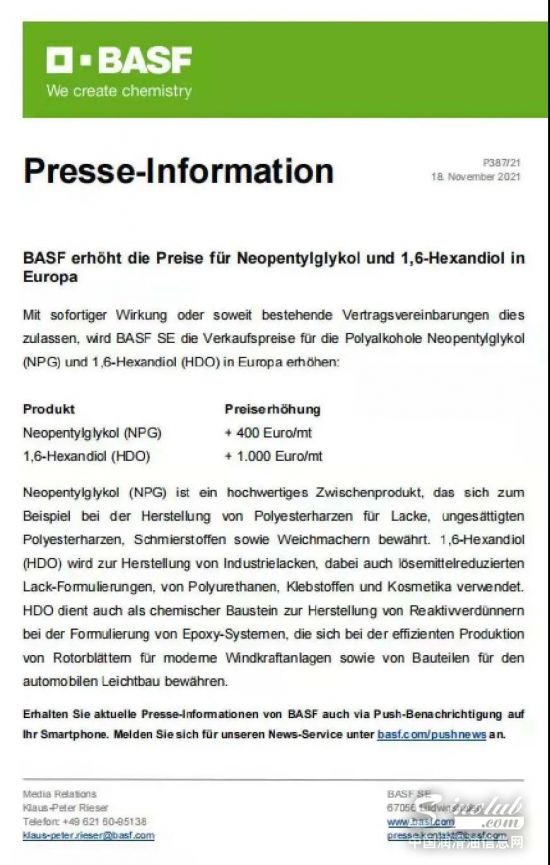 11月18日,巴斯夫发布涨价通知称即日起将上调中间体新戊二醇(NPG)和1,6-己二醇(HDI)产品的价格,其中新戊二醇上调400欧元/吨(约2902元/吨),1,6-己二醇上调1000欧元/吨(约7256元/吨)。