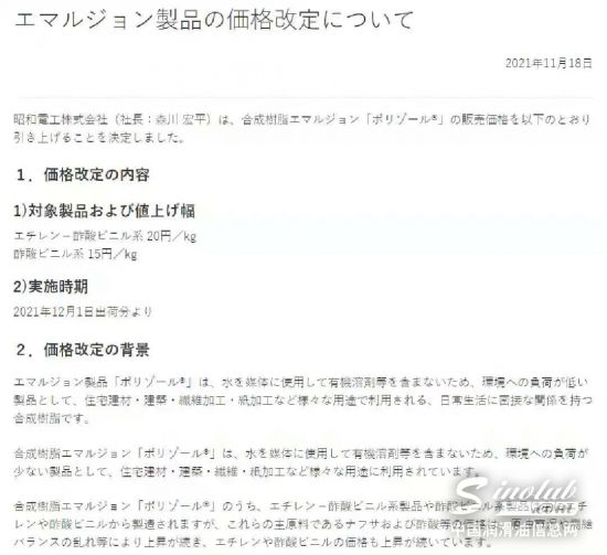11月18日,昭和电工株式会社(Showa Denko)发布Polysol™合成树脂乳液涨价通知,其中乙烯-醋酸乙烯系列上调20日元/千克(约1118元/吨),醋酸乙烯系列从上调15日元/千克(约838元/吨)。