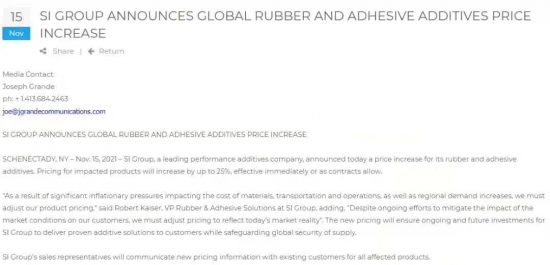 全球高性能添加剂公司圣莱科特集团(SI GROUP)宣布,提高其橡胶和粘合剂价格,受影响产品的价格将上调25%,此次调价从11月15日起生效或根据合同情况生效。