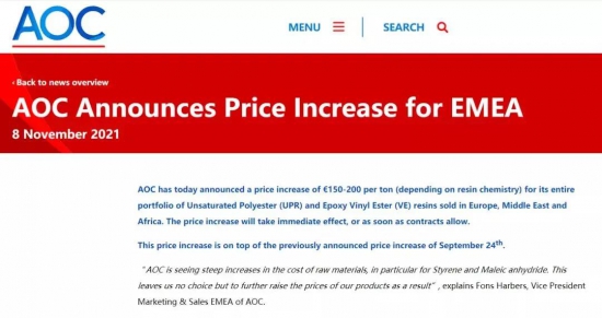 树脂生产商AOC力联思也宣布,将其不饱和树脂、环氧乙烯酯树脂全系列产品在EMEA地区(欧洲、中东、非洲)分别实施涨价,不饱和树脂系列产品涨幅为150-200欧元/吨(约1083-1444元/吨)。