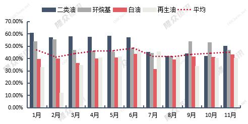 隆众数据显示:本月基础油整体平均开工率在45%,环比增加2.6%。基本持平于10月。本月石蜡基基础油环比增加22%,再生油、白油的开工率均有小幅增加,分别在2.36%,4.56%。隆众数据显示,环烷基基础油开工率有所下降,环比下降11.79%,主要是神木富油停工几天的影响。另外新疆超源本月不在生产环烷基橡胶油,转产生产其他产品也有影响。