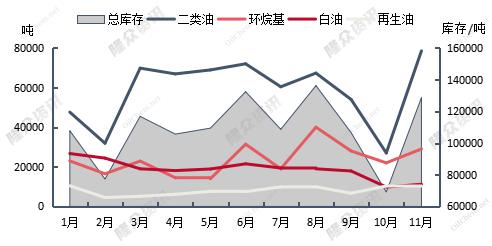 隆众数据显示:11月份各类基础油库存都有不同程度的增加。总库存量环比增加86%,其中石蜡基基础油库存增加最多,环比增加190%。11月份下游润滑油工厂订单量有所减少,库存均保持在3成以内的安全生产库存,没有大幅集中采购意愿,均按需采购为主。因此炼厂成交状况有所下滑。