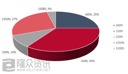 从润滑油生产企业采购型号来看,目前大部分润滑油生产企业采购型号以150N为主,占据采购型号的34%,大于350N型号采购厂家占比27%。60N及以下粘度型号采购厂家占比25%。