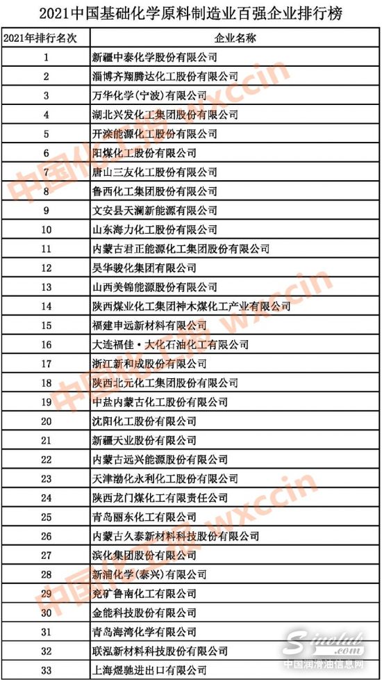 2021中国石油和化工企业500强及基础化学原料制造业百强发布。新疆中泰化学股份有限公司、淄博齐翔腾达化工股份有限公司、万华化学(宁波)有限公司、湖北兴发化工集团股份有限公司、开滦能源化工股份有限公司、阳煤化工股份有限公司、唐山三友化工股份有限公司、鲁西化工集团股份有限公司、文安县天澜新能源有限公司、山东海力化工股份有限公司位列前10强。