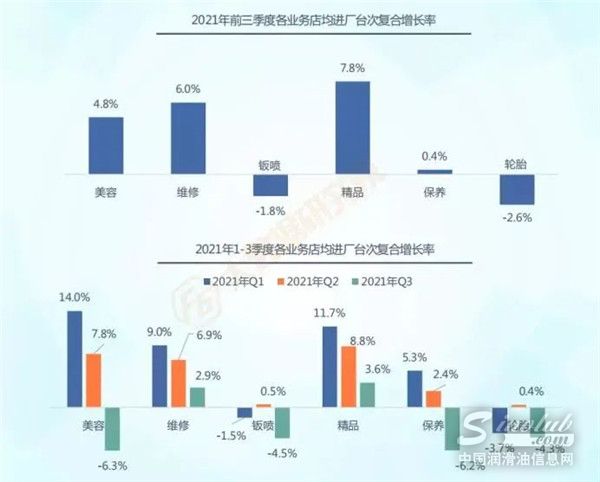 具体到汽服店业务情况,2021年前三季度,精品业务店均进厂台次复合增长率最高,达7.8%,而钣喷、轮胎业务的进场台次均为负增长。