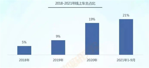 在车主端,车主线上化率持续提升。F6大数据研究院认为,越来越多维修企业开始重视线上引流和拓客渠道的发展,尤其是在经历2020 年疫情之后,线上车主有了显著增长,2021年前三季度车主线上渗透率达21%。自2020年9月开始,月度线上化率始终维持在10%以上。