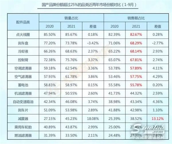 对比近两年1-9月份的配件销售数据可见,在点火线圈、刹车盘、冷却液等多个品类上,国产品牌配件市场份额已赶超外资品牌。