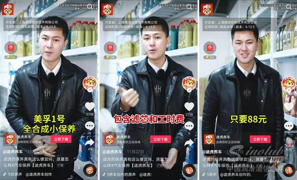 据新浪汽车报道,途虎养车的官方抖音账号上,展现这样一条广告:美孚1号全合成小保养,包含滤芯和工时费,只要88元。