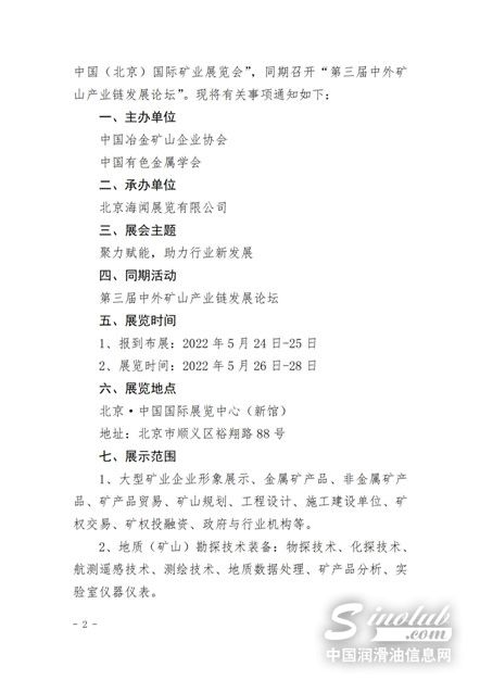为了积极主动融入全球矿业治理体系,参与全球新型矿业合作关系建设,大力推动矿业新发展模式加速形成,助力矿山企业在新时期取得更好发展,由中国冶金矿山企业协会、中国有色金属学会共同主办,北京海闻展览有限公司承办的第八届中国(北京)国际矿业展览会(CIME)定于2022年5月26日-28日在北京中国国际展览中心(新馆)举办,同期将召开第三届中外矿山产业链发展论坛。