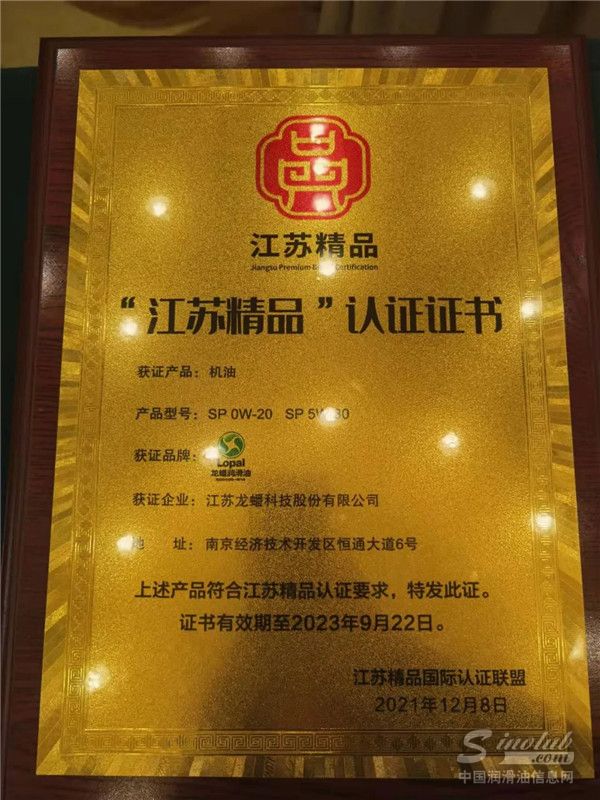 龙蟠科技润滑油产品荣获“江苏精品”认证