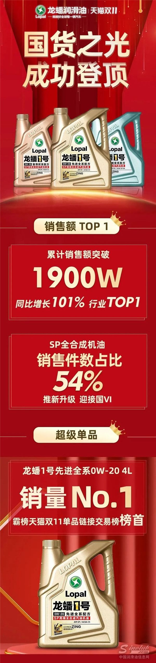 龙蟠1号润滑油作为龙蟠旗下的高端润滑油产品,是国内率先推向市场的SP级别润滑油产品之一,不仅获得了美国石油协会、欧洲汽车制造协会产品认证,同时也获得奔驰、宝马、欧宝等国际知名汽车厂家的认证。该产品投入市场以来,单品销售火速增长,并于2021年双十一期间取得了天猫平台同类产品销售第一名的佳绩。