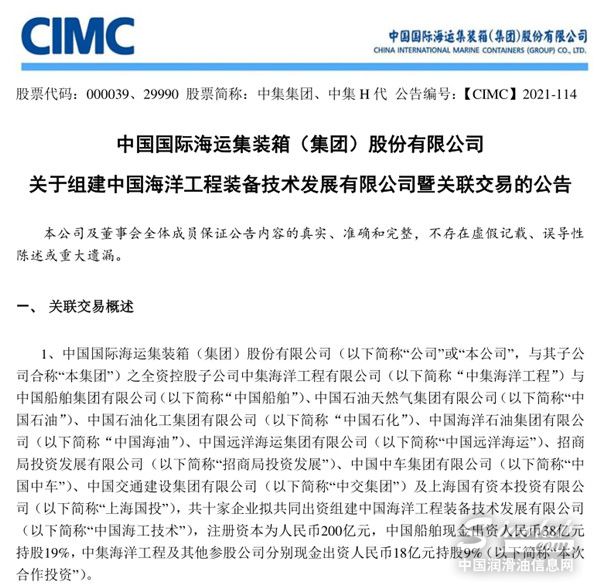 12月24日晚,中集集团发布公告,旗下全资控股子公司中集海洋工程,与中国船舶集团及“三桶油”等十家企业,拟共同出资组建中国海洋工程装备技术发展有限公司(简称“中国海工技术”)。
