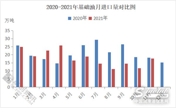 据海关数据显示,11月份国内润滑油基础油进口量为17.68万吨,环比上涨51.55%,同比下跌2.90%。2021年累计进口基础油197.64万吨,累计同比下跌16.60%。