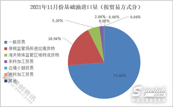 从贸易方式来看,11月份国内进口基础油以一般贸易居首,保税监管场所进出境货物及海关特殊监管区域物流货物分别排名二、三位。据海关数据显示,11月份一般贸易模式进口基础油数量在13.03万吨,占总进口量的73.66%;保税监管场所进出境货物3.35万吨,占进口总量的18.94%;海关特殊监管区域物流货物0.92万吨,占比5.2%。