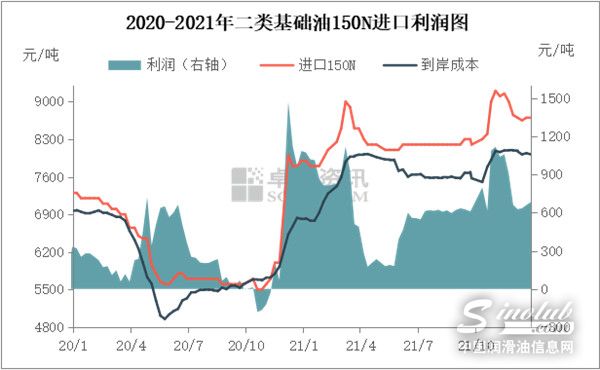 从进口利润来看,11月份基础油进口利润偏好运行,月末附近受国内售价回落影响,利润空间有所收窄。据卓创资讯数据统计,11月国内进口150N理论到岸成本均价在8084元/吨,环比上涨4.55%,进口150N理论利润空间在956.47元/吨,环比上涨14.72%。12月份,外盘价格及国内150N售价均现回落,其中,国内售价回落明显,利润空间继续收窄,预计12月进口150N理论利润均值在651.15元/吨左右。