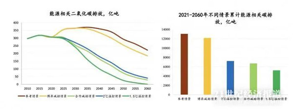 在《能源展望》的参考情景下,各国的现有政策措施难以实现《巴黎协定》气候目标,到2060年能源相关的碳排放仍将达到222亿吨。若各国出台更加积极的转型政策措施,技术进步、能效提升和加快推广,2060能源相关的二氧化碳排放将降至31亿吨,全球温升控制在2摄氏度以内。