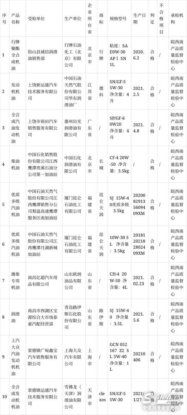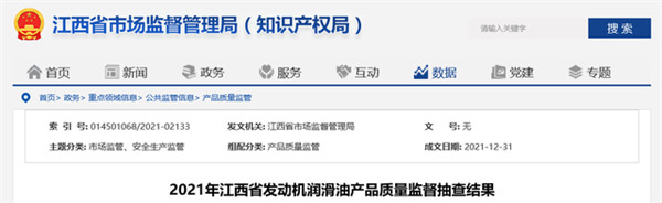 据江西省市场监督管理局网站2021年12月31日消息,2021年,江西省市场监督管理局对全省发动机润滑油产品质量进行了监督抽查。本次抽查了10批次发动机润滑油产品,经检验,全部合格。