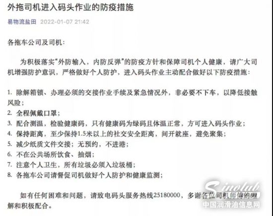 1月7日深夜,”易物流盐田“平台发布《外拖司机进入码头作业的防疫措施》公告,公告表示,请广大司进入码头作业主动配合做好防疫措施:包括除解箱锁、办理必须的交接作业手续及紧急情况外,非必要不下车,以降低接触风险。