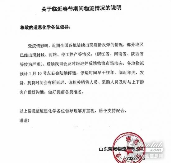 1月5日,道恩集团全资子公司山东荣畅物流有限公司发函称,受疫情反弹影响,部分地区出现封城、封路、停工停产等情况,预计各地物流在1月10日左右会陆续停运!同时表示,今年的物流停运比起往年来说确实早了些。