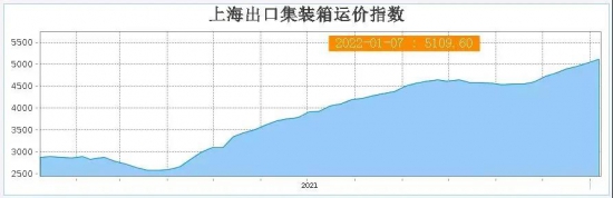 另外,1月7日,上海航运交易所发布的上海出口集装箱综合运价指数(SCFI)首次突破5100点达到为5109.60点,比上期增长62.94点。