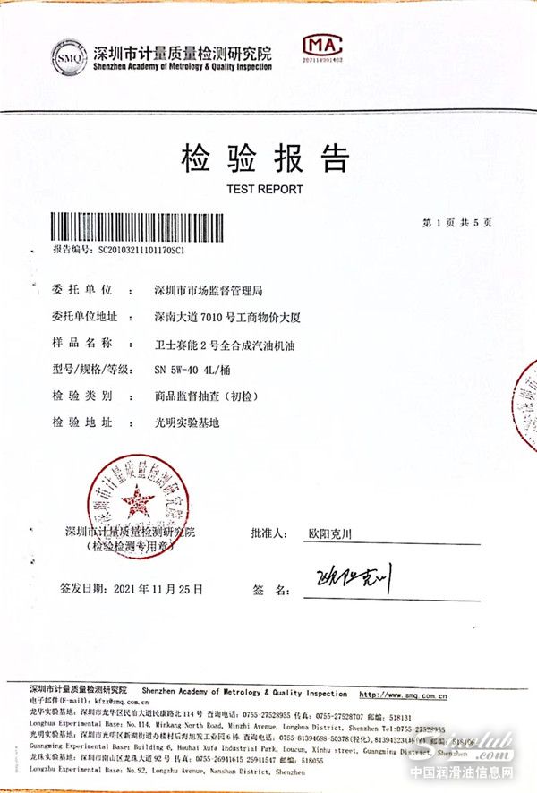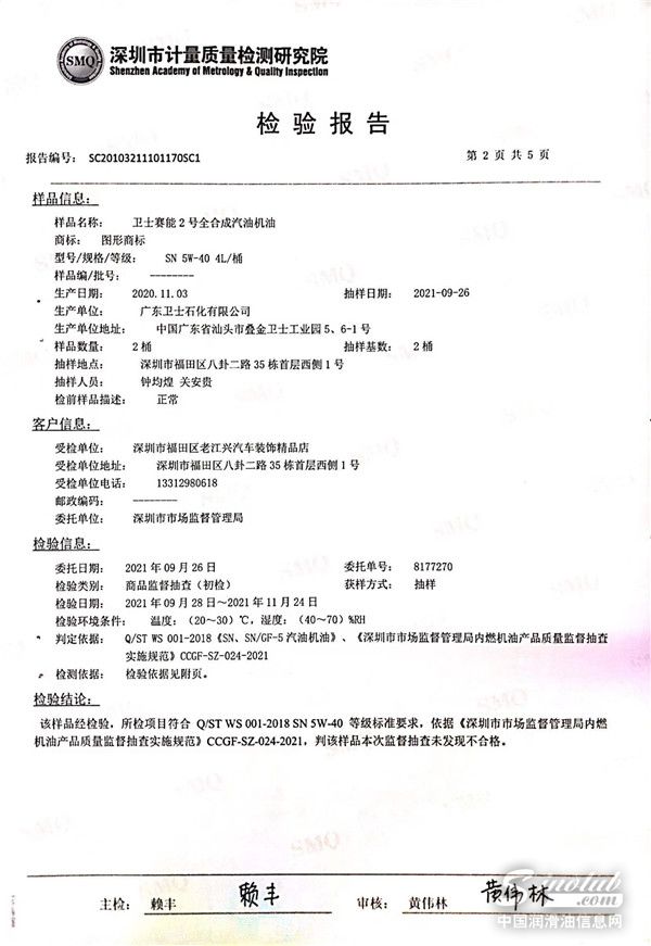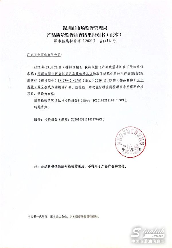 2021年产品质量国家市场监督管理局对我公司生产(销售)的产品-卫士赛能2号全合成汽油机油进行抽查检验,检验项目十一项均为合格。