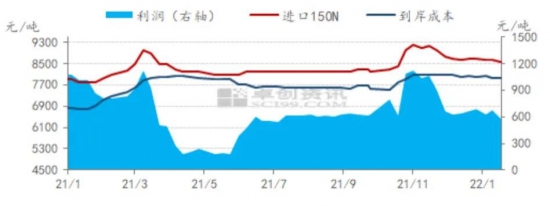 本周进口150N利润在576.80元/吨,环比上周下跌14.15%。本周外盘价格稳定,国内售价回落,进口基础油利润空间收窄。