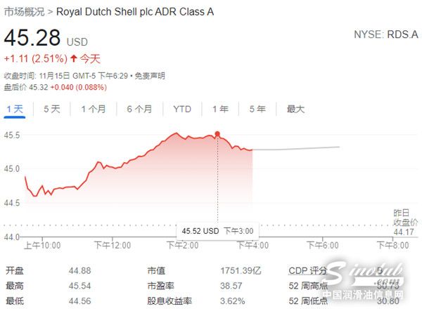 隔夜美股盘中,壳牌一度高见45.54美元,收涨2.51%至45.28美元。