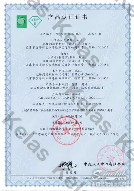 近日,可兰素(天津工厂)获得中国内燃机工业协会和中汽认证中心有限公司联合颁发的CGT&CCAP认证证书,标志着可兰素(天津工厂)的尿素水溶液向高质量发展迈出了更加坚实的一步。