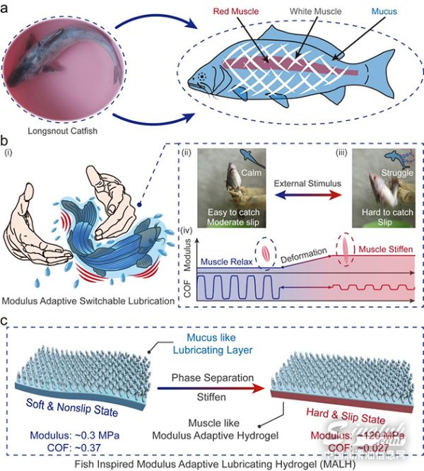 受鲶鱼肌肉硬化触发的表皮系统润滑转变行为启发(图1),中国科学院兰州化学物理研究所固体润滑国家重点实验室研究员周峰团队报道了一种新型模量自适应润滑水凝胶材料。