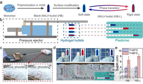 理论模拟结果表明,显著的润滑转变行为归因于模量动态转变的自适应接触演化机制(图2b)。这种基于接触形态的润滑调控行为具有响应快、可逆性好及宽范围载荷耐受性特点(图2c-d)。基于此,科研人员开发出智能润滑型水凝胶子弹和功能贴片,有望用于工程冲击穿刺和移动装备制动等领域(图3、4)。
