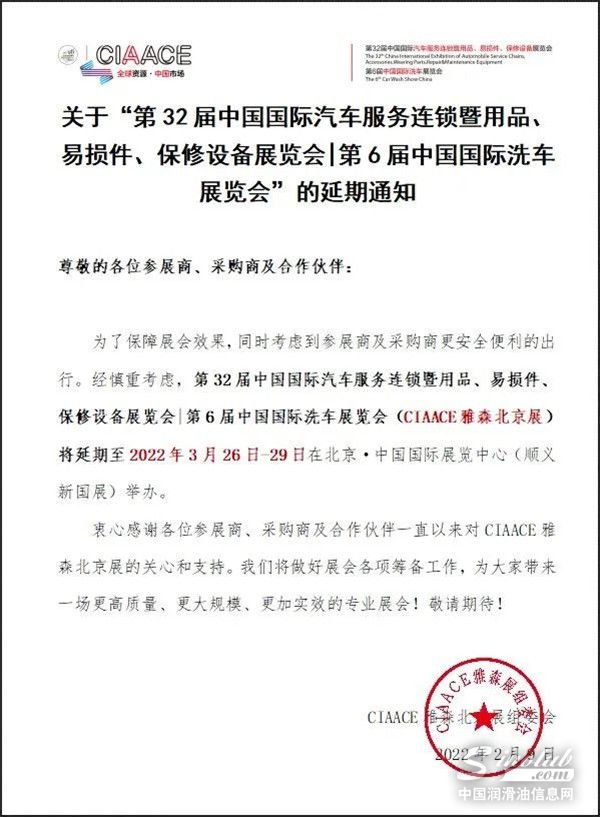 为确保展商和买家参展的最佳效果,第32届中国国际汽车服务连锁暨用品、易损件、保修设备展览会|第6届中国国际洗车展览会(CIAACE雅森北京展)延期至2022年3月26日-29日举办。