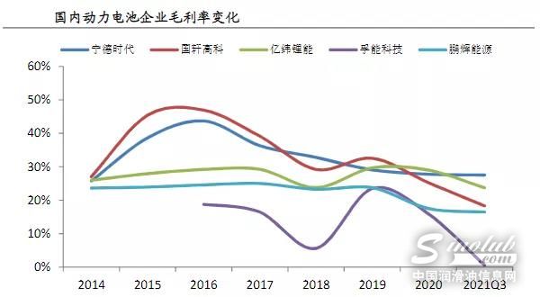 作为动力电池的关键原材料,碳酸锂价格上涨导致电池端盈利承压。2021年,动力电池厂商毛利出现普遍下降。