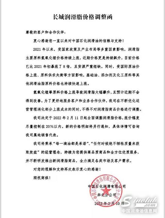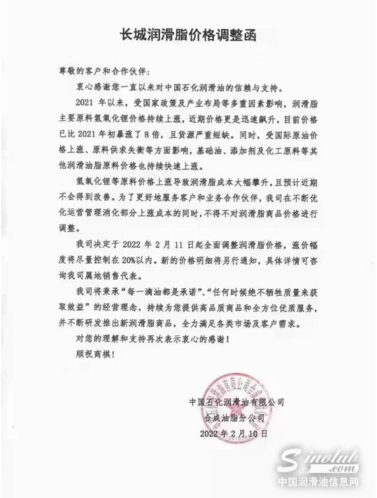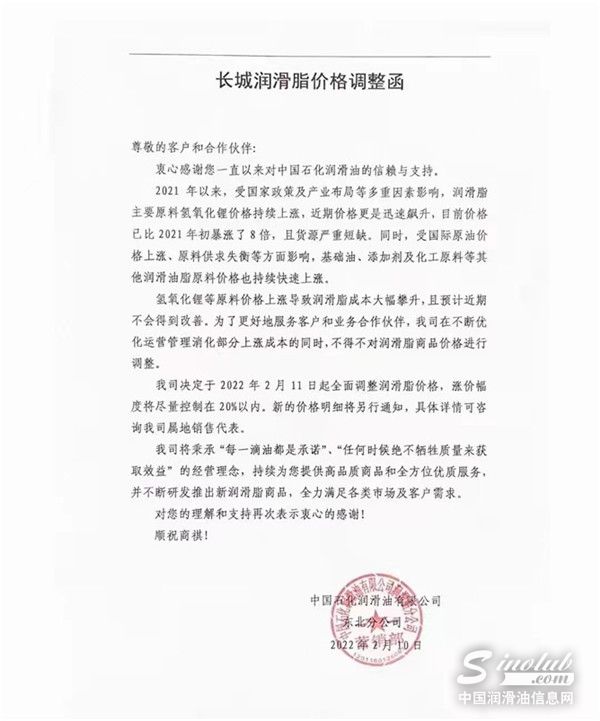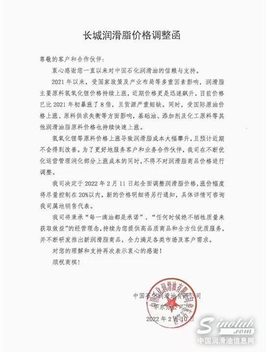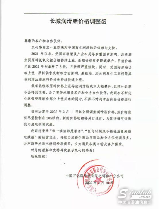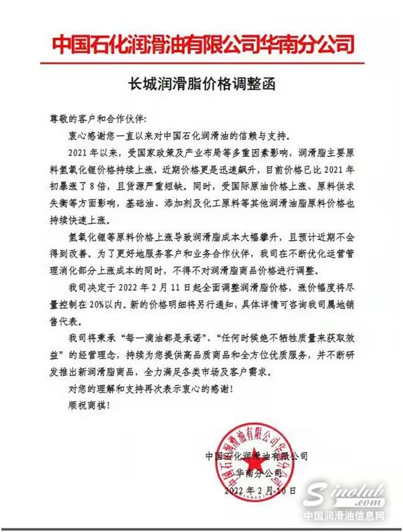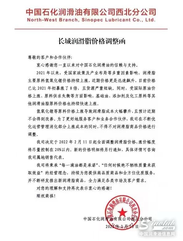 据中国润滑油信息网市场获悉,作为润滑油头部企业的中国石化润滑油有限公司旗下各分公司日前向其客户和合作伙伴发出价格调整函,函件表示,“近期国际原油价格已达92美元/桶(伦敦布伦特原油期货价格),同比增幅超40%,原油价格猛涨已造成了基础油价格攀升;主要添加剂厂商润滑油品添加剂价格同比四季度已上涨8%-15%”;“氢氧化锂市场价格已由2021年初的4万元/吨飙升到近期的36万元/吨,预计后续价格可能会突破50万元/吨。各类原材料成本价格上涨导致润滑油脂商品生产成本攀升,我司已尽最大努力进行降本节费,但仍无法消化原材料价格上涨带来的成本压力”。