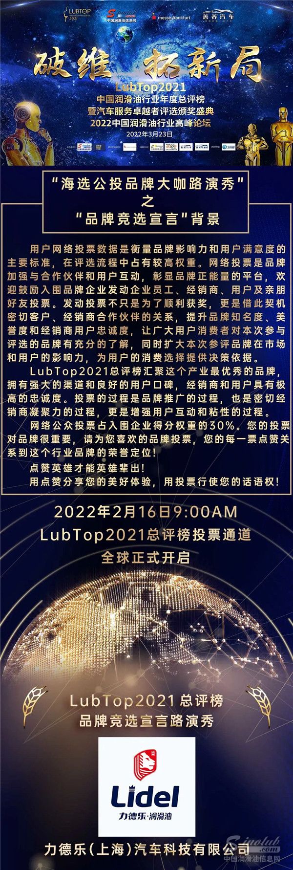 中国润滑油信息网是润滑油门户, 润滑油奥斯卡LubTop总评榜主办方,提供汽车润滑油、工业润滑油以及基础油最新行业资讯、润滑油品牌招商代理,为汽车车主和工业设备用户提供各种润滑油脂、工业油、机油品牌的用油知识。