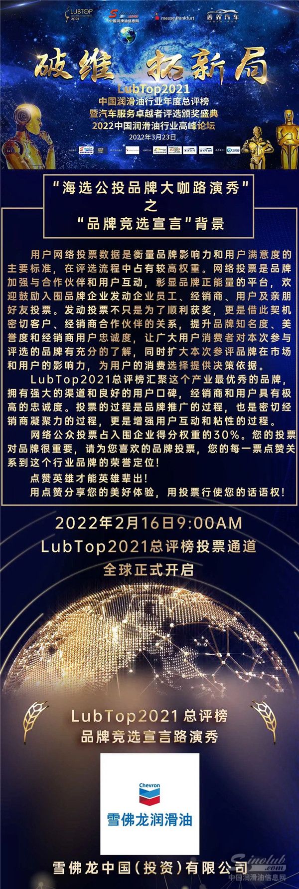 中国润滑油信息网是润滑油门户, 润滑油奥斯卡LubTop总评榜主办方,提供汽车润滑油、工业润滑油以及基础油最新行业资讯、润滑油品牌招商代理,为汽车车主和工业设备用户提供各种润滑油脂、工业油、机油品牌的用油知识。