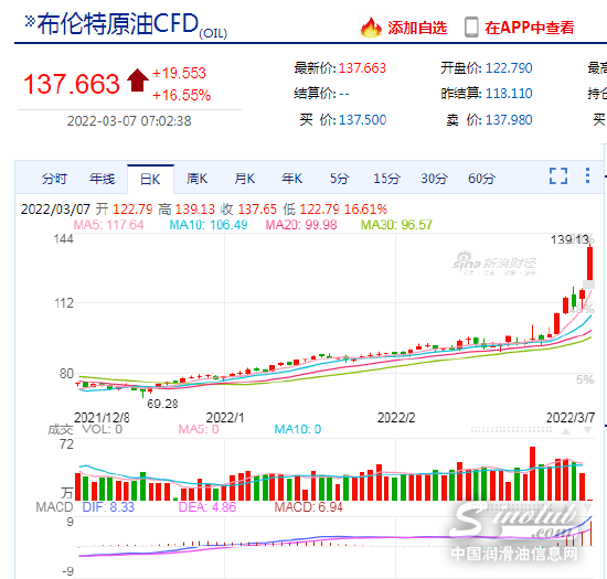 3月7日,布伦特原油开盘跳涨触及139美元/桶,涨幅超16%。