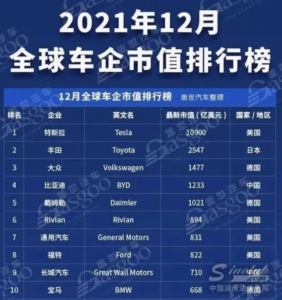 在2021年12月的全球车企市值排名前十中,电动车企占据了3个名额。
